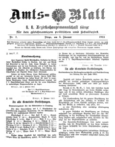 Endlich sind über jene Stellungspflichtige, deren Aufenthalt in den Verzeichnissen nicht angegeben Er¬ eingehende Erhebungen zu pflegen, und ist der folg derselben bis längstens 15. Februar 1911 bekannt¬ zugeben. Die diesjährige Losung wird für Donnerstag den 20. Jänner 1911 um 10 Uhr vormittags anberaumt und wird dieselbe im Sitzungssaale der l. I. Bezirks¬ hauptmannschaft (11. Stoa) abgehalten werden. Der Tag der Losung ist durch offentlichen Anschlag oder sonst ortsüblich mit dem Beisatze zu verlautbaren daß zu derselben jedermann freien Eintritt har uno das personliche Erscheinen bei derselben den Stellungs¬ pflichtigen überlassen bleibt. Bei der Losung haben die Herren Gemeinde=Vor¬ steher oder deren Stellvertreter gegenwärtig zu sein; es wird ihnen empfohlen, behufs Vormerkung der Tos¬ nummern ein alphabetisches Verzeichnis der Namen der zuständigen Stellungspflichtigen der 1. Altersklasse mit¬ zubringen. ex off Z 28 360. Steyr, 29. Dezember 1910. An alle Gemeinde=Vorstehungen. Ausweis über die Stellungsauslagen des Jahres 1910. Die Gemeinde=Vorstehungen werden angewiesen, den Ausweis über die Stellungsauslagen des Jahres 1910 nach dem im Amtsblatte Nr. ex 1907, enthaltenen Muster zuverläßlich bis 20. Jänner 1911 vorzulegen, beziehungs¬ weise eine Fehlanzeige zu erstatten. ex off Z. 74. Steyr, 2. Jänner 1911. An alle Gemeinde=Vorstehungen. Auflegung der Landsturm=Verzeichnisse des Geburtsjahr¬ ganges 1892. Zugleich mit diesem Amtsblatte werden die Verzeich¬ nisse der in der eigenen Gemeinde zuständigen Landsturm¬ pflichtigen des Geburtsjahrganges 1892 zur Kundmachung übersendet. Gemäß § 8, Punkt 19, der Landsturmorganisations¬ Vorschrift sind diese Verzeichnisse durch 8 Tage zur freien Einsicht aufzulegen und dies mittelst öffentlichen Anschlages oder auf sonst ortsüblicher Weise zur allgemeinen Kenntnis zu bringen. Etwa betreffs dieser Verzeichnisse gemachte Ein¬ wendungen sind anher zur Anzeige zu bringen. Die Rückvorlage der Verzeichnisse hat bis längstens 5. Februar l. J. zu erfolgen. - Steyr, 29. Dezember 1910. . 2556/Sch. An alle Gemeinde=Vorstehungen, Grisschul¬ rate und Schulleitungen. Handbuch der Reichsgesetze und Ministerialverordnungen über das Volksschulwesen. Im Auftrage des t. k. Ministeriums für Kultus und Unterricht ist im k. k. Schulbücher=Verlage in Wien, 1., Schwarzenbergstraße 5, die vom k. k. Ministerialrat Dr. Leo Schedlbauer mit Benutzung amtlicher Quellen verfaßte 8. Auf¬ lage des Werkes: Handbuch der Reichsgesetze und der Ministerialver¬ ordnungen über das Volksschulwesen in zwei Bänden erschienen. Diese systematisch geordnete Ausgabe ist mit ver¬ gleichenden Anmerkungen und einer Uebersicht über die Spruchpraxis des Reichsgerichtes, des Verwaltungsgerichts¬ hofes, des Obersten Gerichtshofes sowie der Ministerien, endlich mit den entsprechenden Registern versehen. Um die Anschaffung des Werkes zu erleichtern, ge¬ wahrt der k k. Schulbücher=Verlag einen ermäßigten Sub¬ scriptionspreis von 7 Kronen für ein geheftetes und 10 Kronen für ein in Halbfranz gebundenes Exemplar jedes Bandes. Hievon wird über Ersuchen der k. k. Schulbücher¬ Verlagsdirektion in Wien mit dem Beifügen die Mitteilung gemacht, daß Subscriptionsanmeldungen y. a. entgegenge¬ nommen werden, jedoch nur bis 20. Jänner 1. J. und unter gleichzeitiger Vorlage des entfallenden Betrages. Z. 28282. Steyr, 30. Dezember 1910. An alle Gemeinde=Vorstehungen und k. k. Gendarmerie=Posten=Kommanden. Führung des kaiserlichen Adlers im Siegel der behördlich autorisierten Privattechniker und Bergbauingenieure. Seine k. u. k. Apostolische Majestät haben mit Aller¬ höchster Entschließung vom 5. Dezember 1910 allergnädigst zu genehmigen geruhr, daß die behördlich autorisierten Pri¬ vartechniker und die behördlich autorisierten Bergbauingenieure bei den in ihrem Wirkungskreise gelegenen Ausfertigungen den kaiserlichen Adler im Siegel führen. Hievon wird die Mitteilung gemacht. Z 28.294. Steyr, 30. Dezember 1910. An alle Gemeinde=Vorstehungen. Internationaler Kongreß für Säuglingsschutz in Berlin. In der Zeit vom 11. bis 15. September 1911 wird in Berlin der 111. Internationale Kongreß für Säuglings¬ schutz stattfinden, der alle einschlägigen Fragen in Beratung ziehen und auch Gelegenheit vieren wird, die in Berlin be¬ stehenden Einrichtungen für Sauglingsfürsorge tennen zu lernen. Für den Schluß des Kongresses ist ein Besuch der Internationalen Hygiene=Ausstellung in Dresden in Aussicht genommen, wo in einer besonderen Abteilung die modernen Maßnahmen auf dem Gebiete der Säuglingshygiene zur Darstellung gelangen werden. Zufolge Erlasses der k. k. o.-O. Statthalterei vom 17. Dezember 1910, Z. 8240, werden die Gemeinde¬ Vorstehungen eingeladen, die interessierten Kreise auf diesen Kongreß mit dem Beifügen aufmerksam zu machen, daß da¬ ausführliche Programm seinerzeit veranntgegeben werden wie¬ Anfragen in Angelegenheit des Kongresses sind an das Organisations-Komitee, Berlin K. W., KlopstockstapNr. 18, zu richten.