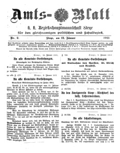 der u. a. Wiitasapinaisajast Sich für den gleichnamigen Politischen uno Schulbezirk. Nr. 2. Steyr, am 12. Jänner Das Amtsblatt erscheint jeden Donnerstag und kann durch die k. k. Bezirkshauptmannschaft Steyr bezogen werden, wo auch Pranumerationspreis jährlich 3 K, halbjährig 2 K 50 h, für porkopflichtige geeignete Inserate angenommen werden. Adressaten mit directer Postversendung jährlich 5 K, halbjährig 2 K 50 h. - Einzelne Nummern kosten 10 h. Soweit der Vorrath reicht, können auch ältere Jahrgänge und einzelne Nummern bezogen werden. Steyr, 9. Jänner 1911 Steyr, 10. Jänner 1911. Z. 730. An alle Gemeinde=Vorstehungen. An alle Gemeinde=Vorstehungen Hinausgabe der Reichsgesetz=Blätter. mit Ausnahme von Garsten, St. Ulrich Unter Einem gelangen die Reichsgesetz=Blatter Stuck und Neustift. Ein an die Gemeinde=Vorstehungen zur Hinausgabe. Bericht Ueber eventuelle Abgange ist binnen drei Tagen anher betreffend den Geldverkehr mit (alter) Guldenwahrung. zu berichten. Der mit dem Erlasse vom 12. November 1908, ex offo Z. 577. Steyr, 2. Jänner 1911 Z. 25.551, Amtsblatt Nr. 47, aufgetragene, aujährlich zu erstattende Bericht verreffend Uebertretungen des Verbotes An alle Gemeinde=Vorstehungen. der Anwendung der früheren österreichischen Guldenwahrung im geschaftlichen Verkehre ist unverzüglich anher vor¬ Betreffend Militärtaxmeldung im Jahre 1911. zulegen. Gemäß § 8 des Militärtaxgesetzes vom 10. Februar 1907, R.=G.=Bl. Nr. 30, haben sich alle militärtaxpflichtigen Z 48/Sch. Steyr, 10. Jänner 1911. Personen im Monat Fanner zu melden. Unter Hinweis auf den y. a. Erlaß vom 13. De¬ An den Zweigverein Steyr Kirchdorf des zember 1907, Z. 27.923, werden die Gemeinde=Vorstehungen angewiesen, tunlichst dafür Sorge zu tragen, daß möglichst kath. Lehrervereines. alle Meldepflichtigen ihrer Meldepflicht entsprechen. Dies wird sich am besten durch die möglichste Publi¬ Der k. k. Bezirksschulrat Steyr erteilt den Mitgliedern kation der bezüglichen Aufforderungsrundmachung erreichen des Zweigvereines Steyr — Kirchdorf des tath. Lehrer¬ andererseits aber auch durch geeignete Aufenthalts¬ lassen, vereines, welche an der Zweiglehrerversammlung am 1. Fe¬ Erhebungen hinsichtlich der hierbezirks zuständigen Tax¬ bruar 1911 um 4 Uhr nachmittags im Musikzimmer des pflichtigen. Kasinos in Steyr teilnehmen, den hiezu erforderlichen Urlaub. Was die Behandlung der einlangenden Meldungen durch die Gemeinden anbelangt, so wird hier auf die ein¬ schlägigen Bestimmungen der Durchführungs=Verordnung Steyr, 9. Jänner 1911 Z. 30 Sch. (Art. 13 u. 14) und auf den eingangs zitierten y. a. Erlaß An alle Schulleitungen. verwiesen. Besonders betont wird, daß jede Meldung mit dem Empfang der heil. Sakramente seitens der Schulkinder. Grasendatum zu versehen ist, daß im Falle, als beide Eltern oder ein Elternteil des Meldepflichtigen vereits ver¬ Zufolge Erlasses des k. k. Landesschulrates vom storben ist, stets der Sterbeort und das genaue Sterbe¬ 21. Dezember 1910, Z 8766, har das bischöfliche Ordi¬ darum beizusetzen ist, endlich noch, daß die bis 10. Jänner nariat in Linz mit der Note vom 20. November 1910, Februar, die bis Ende 3. 9068, mitgeteilt, daß durch die neuen Verordnungen eingelangten Meldungen bis 1. über das zum ersten Empfang der heil. Sakramente der Jänner erstatteten Meldungen bis Ende Februar mittelst Buße und des Altares notwendige Alter der Kinder die summarischer Konsignation nach dem unter Z. 27.066 vom Zahl der mit Erlaß des bischöflichen Ordinariates vom 1. Dezember 1909, Amtsblatt Nr. 51, versendeten Muster, 3. November 1885, Z. 74, (Linzer Tiozesanblatt 1885, anher vorzulegen sind. St. XXVII, Nr. 44) angeordneten und nach § 15 des