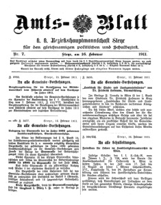 S der u. a. Wastaupitsijasi Seit für den gleichnamigen Politischen uno Schulbezirk. Nr. 4. 1911. Steyr, am 10. Februar Das Amtsblatt erscheint jeden Donnerstag und kann durch die k. k. Bezirkshauptmannschaft Steyr bezogen werden, wo auch geeignete Inserate angenommen werden. Pranumerationspreis jährlich 5 K, halbjährig 2 K 50 h, fur porropflichtige Adressaten mit directer Postversendung jährlich 5 K, halbjährig 2 K 50 h. — Einzelne Nummern kosten 10 h. Soweit der Vorrath reicht, können auch ältere Jahrgänge und einzelne Nummern bezogen werden. Steyr, 15. Februar 1911. Z. 3760. 11. Februar 1911. Steyr, Z. 3456. An alle Gemeinde=Vorstehungen. An alle Gemeinde=Vorstehungen. Vergütungsbetrag für die Verpflegung der Militär¬ „Handbuch für Stadt= und Landgemeindeamter“ von mannschaft vom Fähnrich abwärts auf dem Durchzuge Dr. Friedrich Hofmann, Anempfehlung. im Jahre 1911. Im Verlage F. Temsty in Wien ist der 1. Band Am Anschlusse erhalten die Gemeinde=Vorstehungen je des vom Stadtrat Dr. Friedrich Hofmann in Graz ein Exemplar der Kundmachung der k. k. Statthalterei in herausgegebenen „Handbuches für Stadt= und Land¬ Linz vom 7. Februar 1911, Z. 915/VII, betreffend den gemeindeamter in den im Reichsrate vertretenen König¬ Vergütungsbetrag für die Verpflegung der Militarmannschaft reichen und Landern“ erschienen. vom Fähnrich abwarts auf dem Durchzuge im Jahre 1911 Da sich dieses Wert, welches eine leichte und aus¬ zur Kenntnisnahme und sogleichen Verlautbarung. reichende Drientierung über den Stand der für Ge¬ meindeverwaltungen wichtigen Gesetze und über die bei den einzelnen Materien in Betracht kommende Judikatur ex offo Z. 3477. Steyr, 16. Februar 1911. ermöglicht, als ein praktischer Behelf für die Gemeinde¬ ämter und deren Organe erweisen durfte, werden die An alle Gemeinde=Vorstehungen. Gemeindevorstehungen auf das Erscheinen dieses Werkes aufmerksam gemacht. Anlegung der Sturmrolle der im Jahre 1892 geborenen Landsturmpflichtigen, Sturmrollenauszuge. Z. 289/Sch. Steyr, 13. Februar 1911. im Sinne der Bestimmungen des § 8, Punkt der Landsturmorganisationsvorschrift werden gleichzeitig mit An alle Schulleitungen. diesem Amtsblatte die h. a. nunmehr endgültig überprüften Verzeichnisse der zuständigen im Jahre 1892 gevorenen Ferialkurs für Lehrer im Handfertigtensunterrichte in Landsturmpflichtigen an die Gemeinde=Vorstehungen zun Wien. Zwecke der Anlage der Sturmrolle des Geburtsjahr¬ ganges 1892 (in einem Exemplar) übermittelt. Zufolge Erlasses des k. k. L.=Sch.=R. vom Dieses Exemplar ist den übrigen Sturmrollen beizu¬ 26. Jänner l. J., J. 128, wird der Verein für schließen und bilden die Sturmrollen der Geburtsjahrgange Knabenhandarbeit für Oesterreich in Wien in 1869 bis 1892 die Sturmrolle für das Jahr 1911. diesem Jahre, in der Zeit vom 17. Juli bis Aus dieser Sturmrolle ist ein ziffermäßiger Auszug 12. August an seiner 1. Wiener Schulwerkstatte, nach Muster 3 der obzitierten Vorschrift zu verfassen XVI., Koppstraße 13, den 24. Ferialkurs zur Heran¬ Die Verzeichnisse der 1892 Geborenen sind bei den bildung von Lehrern des Handfertigkeits=Unterrichtes Gemeinde=Vorstehungen einer nochmaligen genauen Durch¬ für Knaben abhalten. sicht zu unterziehen und hinsichtlich der Rubrik 9 (Gewerbe, Hievon wird die Lehrerschaft mit dem Beifügen sonstiger Lebensberuf und 12 (gegenwärtiger Aufenthalt), verständigt, daß Anmeldungen zur Teilnahme an dem eventuell zu ergänzen. Kurse an den genannten Verein, etwaige Urlaubsgesuche Diese Verzeichnisse, sowie die Sturmrollenauszuge im vorgeschriebenen Dienstwege hieramts einzubringen sind bis längstens 1. März l. J. anher in Vorlage zu sein werden. bringen.