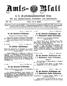 der u. a. Wiitasaajaanissait für den gleichnamigen politischen und Schulbezirk. 1911. Nr. 14. Steyr, am 6. April Das Amtsblatt erscheint jeden Donnerstag und kann durch die k. k. Bezirkshauptmannschaft Steyr bezogen werden, wo auch Pranumerationspreis jährlich 5 K, halbjährig 2 K 50 h, für portopflichtige geeignete Inserate angenommen werden. Adressaten mit directer Postversendung jährlich 5 K, halbjährig 2 K 50 h. - Einzelne Nummern kosten 10 h. Soweit der Vorrath reicht, können auch ältere Jahrgänge und einzelne Nummern bezogen werden. Steyr, 31. März 1911. Z. 7411. Steyr, 5. April 1911. An alle Gemeinde=Vorstehungen. An alle Gemeinde=Vorstehungen und Hinausgabe der Reichsgesetz=Blätter. l. I. Gendarmerie=Posten=Kommanden. Unter Einem gelangen die Reichsgesetz=Blatter Stuck Warnung vor dem Unterstützungsschwindler XX XXVI an die Gemeinde=Vorstehungen zur Hinausgabe. Raimund Balcar. Ueber eventuelle Abgange ist binnen drei Tagen anher Raimund Balcar, am 3. September 1858 zu Neu¬ zu berichten. Biela geboren, nach Proskowitz, B.-H. Mahr.=Ostrau, zu¬ ständig, Witwer, tatholisch, Schuhmacher. Z. 567/Sch. Steyr, 27. März 1911. dem Die Gemeinde=Vorstehungen werden beauftragt, Genannten außer nach fallweiser Sicherstellung An sämtliche Schulleitungen. Unter¬ keinerlei faktischen augenblicklichen Bedürfnisses stützung zu verabfolgen, demselben vielmehr bei Vorhanden¬ Urlaub für Lehrpersonen zur Teilnahme an der Dele¬ sein der gesetzlichen Voraussetzungen schuhpolizeilich zu be¬ gierten-Versammlung des katholischen Landes=Lehrer¬ handeln. vereines in Linz. Zufolge Erlasses vom 19. März 1911, Z. 2587, be¬ Z 7555 u. 7581. Steyr, 31 März 1911. willigt der k. k. Landesschulrat den Mitgliedern des Vereins¬ ausschusses, ferner den Obmannern der Zweigvereine und An alle Gemeinde=Vorstehungen und deren Stellvertretern behufs Teilnahme an der in Linz statt¬ l. I. Gendarmerie=Posten=Kommanden. findenden Delegiertenversammlung des katholischen Landes¬ Lehrervereines den erbetenen Urlaub für Dienstag den Widerruf. 18. April 1. J. Die Ausforschung des Georg Fenzl, y. a. Amtsblatt Nr. 12, ex 1911, und der Zwanglinge Josef Fischer und Karl Spieß, Z. 7465. Steyr, 30. März 1911. h. a. Amtsblatt Nr. 12. ex 1911, ist einzustellen. An alle Gemeinde=Vorstehungen. Vorlage der Nachweisungen über Feuer= und Hagelschaden Steyr, 1. April 1911. Z. 7582. im Jahre 1911. An alle Gemeinde=Vorstehungen und Die Gemeinde=Vorstehungen werden eingeladen, Nachweisungen über Feuer= und Hagelschaden im Jahre 1910 l. k. Gendarmerie=Posten=Kommanden. mit Verwendung der hiefür vorgeschriebenen Formularien Ausforschung des Thomas Klanda, Abgabe in eine es längstens 20. April 1911 anher nachzuweisen, event. Zwangsarbeitsanstalt. und Fehlberichte zu erstatten. Thomas Klauda, der mit dem Erlasse der mährischen Statthalterei vom 13. September 1910, Z. 62.511, für die