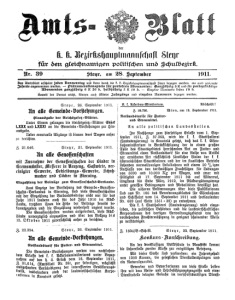 der K. u. Weishauptmiseksi Sie für den gleichnalligen Politischen uno Schulbezirk. Nr. 39 1911. Steyr, am 28. September Das Amtsblatt erscheint jeden Donnerstag und kann durch die k. k. Bezirkshauptmannschaft Steyr bezogen werden, wo auch geeignete Inserate angenommen werden. — Pranumerationspreis für portofreie Abonnenten: Ganzjährig 5 K und für portopflichtige Abonnenten ganzjährig 6 K 20 h, halbjährig 5 K 10 h. —Einzelne Nummern kosten 10 h. Soweit der Vorrat reicht, können auch ältere Jahrgänge und einzelne Nummern bezogen werden. Abschrift! K. k. Ackerbau=Ministerium. Steyr, 26. September 1911. Wien, am 19. September 1911. Z. 38.780. An alle Gemeinde=Vorstehungen. Notstandstarife für Futter¬ Hinausgabe der Reichsgesetz=Blätter. und Strenmittel. Unter Einem gelangen die Reichsgesetz-Blätter Stuck An alle politischen Landesstellen. LXXX und LAAA an die Gemeinde=Vorstehungen zur Hin¬ ausgabe. Im Nachhange zum hierseitigen Erlasse vom 1. Sep¬ Ueber eventuelle Abgange ist binnen drei Tagen anher tember 1911, Z. 37.362, wird die t. k. Statthalterei zu berichten. (Landesregierung) in Kenntnis gesetzt, daß das k. k. Eisen¬ bahnministerium in Berücksichtigung der in einem großen Steyr, 21. September 1911. 3. 21.646. Teile des Staatsgebietes herrschenden Nor an Futter= und Streumittel einen Notstandstarif für eine Reihe von Artikel An alle Genossenschaften der erwähnten Art rücksichtlich sämtlicher Linien der k. österreichischen Staatsbahnen und der im staatlichen Betriebe mit Ausnahme der Genossenschaften der Binder in stehenden normalspurigen Lokalbahnen mit einem 50 % igen Kremsmünster, Messerer in Neuzeng, Gastwirte, ver¬ Nachlasse von den tarismäßigen Frachtsätzen für Ladungen einigter Gewerbe, Bekleidungs-Gewerbe, Schuh¬ von 5000 und 10.000 Kg pro Wagen, und zwar mit macher und Lacker in Sterning. Giltigkeit ab 17. September 1911 bis auf Widerruf, längstens bis Ende März 1912, im Rückvergütungswege Einzahlung der Beiträge zum Genossenschafts=Verbande. unter gewissen Bedingungen und Modalitäten bewilligt hat. Laut Anzeige der Vorstehung des Gewerbe=Genossen¬ Die näheren Bestimmungen über diese Publikationen schafts=Verbandes in Sierning, sind viele Genossenschaften sind aus Nr. 106 des Verordnungsblattes für Eisenbahnen mit der Einzahlung der Verbandsbeitrage nicht nur für das und Schiffahrt vom 14. September 1911 und fortlaufender Jahr 1911 sondern auch für das Jahr 1910 im Rück¬ Nr. 689 (auf Seite 1551=32) zu entnehmen. stande, trotzdem ihnen die Höhe der Beitrage vereits be¬ Die k. k. Statthalterei (Landesregierung) wird einge¬ kanntgegeben und die Einzahlung wiederholt urgiert wurde. laden, die politischen Behörden und die landwirtschaftlichen Die Genossenschaften werden aufgefordert, diese Rück¬ Korporationen des dortigen Verwaltungsgebietes von der stände unverzüglich einzuzahlen und über den Vollzug vis vorstehenden Frachtermäßigung in geeignet scheinender Weise 15. Oktober 1911 zuversichtlich anher zu berichten. zu verständigen. ........... Steyr, 26. September 1911. Z. 22.394. Steyr, 22. September 1911. Z. 1604/B=Sch=R. Konkurs-Ausschreibung. An alle Gemeinde=Vorstehungen. An der dreiklassigen Volksschule in Neustift kommt Notstandstarif für Futter= und Streumittel. die Lehrerstelle zweiter Klasse zur endgültigen Besetzung. Die Gemeinde=Vorstehungen werden von nachstehen¬ Mit dieser Stelle sind verbunden: ein Jahresgehalt dem Erlasse des k. k. Ackerbauministeriums unter Bezug¬ von 1200 Kronen, die gesetzlichen Dienstalterszulagen und nahme auf den y. a. Erlaß vom 16. September 1911 ein Naturalquartier. Z. 21.614, (Amtsblatt Nr. 381, zur sofortigen, möglichst Bewerber und Bewerberinnen um diese Stelle haben weitgehenden Verstandigung der interessierten Bevölkerungs¬ ihre mit dem Reise= und Lehrbefähigungszeugnisse und einer kreise, insbesondere auch der landwirtschaftlichen KorpoDiensttabelle belegten Gesuche im vorschriftsmäßigen Dienst¬ rationen in Kenntnis geseh.