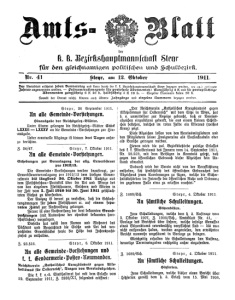 der u. U. Weishauptmannschaft S für den gleichnamigen Politischen uno Schulbezirk. Nr. 41 Steyr, am 12. Oktober 1911. Das Amtsblatt erscheint jeden Donnerstag und kann durch die k. k. Bezirkshauptmannschaft Steyr bezogen werden, wo auch geeignete Inserate angenommen werden. — Pränumerationspreis sur portofreie Abonnenten: Ganzjährig 5 K und für portopflichtige Abonnenten ganzjährig 6 K 20 h, halbjährig 5 K 10 h. - Einzelne Nummern kosten 10 h. Soweit der Vorrat reicht, können auch ältere Jahrgänge und einzelne Nummern bezogen werden. „Der Reichsverein „Katholisches Kreuzbundnis gegen Steyr, 26 September 1911. Alkoholismus für Oesterreich mit dem Sitze in Wien, har An alle Gemeinde=Vorstehungen. h. d. Unmittelbar zur Anzeige gebracht, daß er Vereins¬ abzeichen einzufuhren gedenkt, die aus einem kleinen Schild¬ Hinausgabe der Reichsgesetz=Blätter. chen bestehen, welches im roten Felde ein silbernes (weißes Unter Einem gelangen die Reichsgesetz=Blatter Stuck Kreuz) zeigt. LXXXII — LAAAV an die Gemeinde=Vorstehungen zur Hin¬ Diese Abzeichen sollen von den Vereinsmitgliedern und ausgabe. den Mitgliedern seiner Zweigvereine als Vorstecknadeln oder Ueber eventuelle Abgange ist binnen drei Tagen anher als Brosche getragen werden. zu berichten. Hievon wird die pol. Bezirksbehörde zufolge Erlasses Steyr, 7. Oktober 1911. Z. 24/47. des t. k. Ministeriums des Innern vom 14. September 1911, Nr. 28.559, mit dem Beifügen in Kenntnis gesetzt, daß An alle Gemeinde=Vorstehungen. gegen den offentlichen Gebrauch dieser Abzeichen kein An¬ Erhebungen zur Veranlagung der allg. Erwerbsteuer stand obwaltet. pro 1912/13. Dadurch wird der Verein nicht von der Verpflichtung Die Gemeinde=Vorstehungen werden beauftragt, enthoben, sich hinsichtlich des offentlichen Gebrauches des Erwerbsteuerveranlagung pro 1912/13 dem hiesigen Steuer¬ Abzeichens jenen Anordnungen zu fügen, welche die Sicher¬ referate bis längstens 26. Oktober 1911 Auszuge aus heitsbehörden im Interesse der öffentlichen Ruhe und Ordnung dem Fleischbeschau=Protokoll über die Art und Menge des im gegebenen Falle etwa zu erlassen erachtet. von den einzelnen Fleischhauern, Selchern und Wirten in der Zeit vom 1. Juli 1910 bis 30. Juni 1911 geschlach¬ Z. 1688/Sch. Steyr, 4. Oktober 1911. teten Viehes zu übersenden. Der Auszug ist derart zu verfassen, daß die Schlach¬ An sämtliche Schulleitungen. tungsmengen für jeden Fleischhauer 2c. auf einem sepa¬ raten Fertel zur Nachweisung gelangen. Stipendisten. Ferner ist eine Nachweisung der dort bekannten Grund¬ Jene Schulleitungen, welche dem h. a. Auftrage vom pachtungen (mit Ausnahme der ohnedies bekannten Herr¬ 3. Oktober 1907, Z. 1900 Sch., Amtsblatt Nr. 41, schäftlichen) vorzulegen. Vorlage des Berichtes über Lehrer, welche infolge Genusses Dieselbe hat nebst dem Namen und Wohnort des eines Stipendiums reversmäßig verpflichtet sind — bis nun Pachters und Verpachters die Große und Art des ver¬ nicht entsprochen haben, werden angewiesen, den erwähnten pachteten Grundstückes sowie die Höhe des Jahrespacht¬ Bericht nunmehr ungesaumt in Vorlage zu bringen. zinses zu enthalten. Gleichzeitig erhalten die Schulleitungen den Auftrag, derartige Termineingaben rechtzeitig anher einzusenden. Steyr, 6. Oktober 1911. Z. 23.316. An alle Gemeinde=Vorstehungen und Steyr, 4. Oktober 1911. Z. 1689/Sch. 1. 1. Gendarmerie=Posten=Kommanden. An sämtliche Schulleitungen. Reichsverein „Katholisches Kreuzbündnis gegen Alko¬ Hitzferien. holismus für Oesterreich“, Tragen von Vereinsabzeichen. Jene Schulleitungen, welche bisher einen Bericht über Die k. k. o.ö. Statthalterei hat mit dem Erlasse vom Hitzferien gemäß dem h. a. Erlaß vom 15. Mai 1906, 22. September 1911, Z. 5288/XI, folgendes eröffnet: