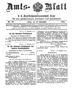 Haare, graue Augen, hohe Stirn, Nase uno uno regular Zähne gut, Kinn-oval und trägt Schnurbartanug; er spricht deutsch und ist Knecht; auch ist derselbe stellungspflichtig. Bekleidet war dieser Zwangling mit der graubraunen Winter=Lodenmontur (Zwanglingsmontur), ferner mit Hemo, Gatte, Schnürschuhen und sonstigen Kleinigkeiten, welche Sorten mit der Marke „Zwangsarbeitsanstalt Laibach ver¬ sehen sind. Die Gemeinde=Vorstehungen und k. k. Gendarmerie¬ Vosten=Kommanden werden angewiesen, nach dem Genannten die Nachforschungen sogleich einzuleiten und denselben im tuierungsfalle anzuhalten, damit dessen Einlieferung ver¬ anlaßt werden kann. Steyr, 16. November 1911. Z. 26.378. An die Gemeinde=Vorstehungen des Gerichts¬ bezirkes Kremsmünster. Straßensperre. Zufolge Schreibens der k. k. Bezirkshauptmannschaft in Wels vom 14. November l. J., Z. 25.140, wird infolge Abgrabung des „Waldgrabens im Zuge der Tam dacher-Kremsmünsterer Bezirksstraße (nächst Steinerkirchen) der k. k. Bezirks der Redaktion man des Sie 18 diese Straßenstrecke vom 16. d. M. angefangen durch zirka 4 Wochen für den Fuhrwertverkehr abgesperrt. Der Verkehr wird durch eine Nebenstraße aufrecht erhalten. Hievon sind die Interessenten sogleich zu verstandigen. Steyr, 12. November 1911. Z. 25.975. An alle Gemeinde=Vorstehungen und l. k. Gendarmerie=Posten=Kommanden. Stand der Tierseuchen im polit. Bezirke Steyr (Land). Es besteht die Maul= und Klauenseuche in den Gemeinden Gaflenz, Garsten, Großraming, Lausa, Losenstein, Neustift, Reichraming, St. Ulrich, Ternberg, Weyer Land und Marti. Die Schweineseuchel=pest) in einem Hofe in Furtder Gemeinde Pfarrkirchen. ber In letzter Zeit sind in der Gemeinde Neustift Hofberg 4 Jungrinder, in Grub und Platten und in der Gemeinde Lausa je 1 Rind an Rauschorand ge¬ fallen. Der k. k. Statthaltereirat Walderdorff. ruckerei Steyr. - Haassche Buch