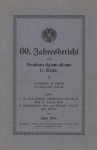 Jahresbericht Bundesrealgymnasiums in Steyr. Veröffentlicht am Schlusse des Schuljahres 193637. Inhalt: 1. Die Naturschutzflora Oberösterreichs. Von St.=R. Prof. Dr. Heinrich Seidl. 2. Schulnachrichten über das Schuljahr 1936/37. Vom Direktor. Steyr 1937. Herausgeber: Direktion des Bundesrealgymnasiums in Steyr, O.=Oe. Druck: Vereinsdruckerei Steyr.