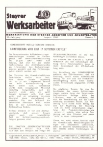 BETRIEBSRAT ALS ZUTRÄGER ? Über die Notwendigkeit der Erwachsenenbildung gibt es keine Meinungsverschiedenheiten. Unternehmer, Arbeiterkammer und Gewerkschaft finanzieren Institute, die eine Weiterbildung ermöglichen. Mit einem Aufwand von 62 Millionen Schilling wurde von der Arbeiterkammer ein Bildungszentrum in Steyr gebaut und im Juni eröffnet. Wir meinen, dass Betriebs- und Abt.- Leiter, Meister sowie der Betriebsrat genug Probleme zu lösen hätten, als sich als Gerichtsherren über Waschraumdebatten zu betätigen. Im übrigen sei jenen Herren das Staatsgrundgesetz Art.l in Erinnerung gebracht, der die freie Meinungsäußerung des Staatsbürgers garantiert. (AUCH IM HAUPTWERK) Seit Jahren besuchen Kollegen aus dem Steyr-Werk Fortbildungskurse und schließen sie positiv ab. Sie tun dies in der Hoffnung ihre berufliche Position zu verbessern, dies um so mehr, als sie auch von der Werksdirektion ermutigt werden. Dass diese erhoffte Verbesserung in den seltensten Fällen eintritt, ist eine alte und oft geführte Diskussion. So unterhielten sich kürzlich auch darüber einige Kollegen im Waschraum und jeder hatte darüber seine Meinung. Diese Debatte, besser ge- gesagt die Meinung eines Kollegen, erfuhr der Abteilungsbetriebsrat und durch diesen die Vorgesetzten. Man sollte nun glauben, dass jene Vorgesetzte Zuträgereien nicht ernst nehmen, so sieht man sich im gegebenen Fall getäuscht. Sicher nach dem Motto "wo kommen wir denn hin wenn ein Arbeiter eine "eigene" Meinung hat, rief er nach Sühne. Besagter Kollege dessen Meinung höheren Orts scheinbar nicht gefragt ist, wurde vor ein Tribunal beordert. Betriebsleiter, Abteilungsleiter, Meister und ein Betriebsrat der SP-Fraktion bedrängten den Kollegen, der es wagte zu sagen was nicht sein durfte. ■MMMMnMMKMKMMWmWMnMM» Sollten besagte Herren jedoch das Bedürfnis haben mit einem Mitarbeiter zu sprechen , dann ist dazu ein so großes Aufgebot nicht nötig. Die geäußerte Bemerkung des Betriebsrates an den Kollegen und Absolventen verschiedener Kurse "WAS BIST DEN SCHON MIT DEINEN KURSEN" unterstützt kaum die Bemühungen seines Fraktionskollegen AK-Präsident Sepp Schmidt, noch mehr Bildungsmöglichkeiten für die Arbeiter und Angestellten zu schaffen. Denn für diese Bemühungen bekommt er im Monat September den Ehrenring der Stadt Steyr.