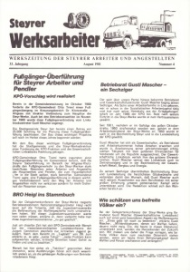 WERKSZEITUNG DER STEYRER ARBEITER UND ANGESTELLTEN 33. Jahrgang August 1981 Nummer 4 Fußgängei^Überführung für Steyrer Arbeiter und Pendler KPÖ-Vorschlag wird realisiert Bereits in der Gemeinderatssitzung im Oktober 1980 forderte der KPÖ-Gemeinderat Otto Treml einen Fußgängerübergang im Kreuzungsbereich Dr. Klotzstraße — Altgasse mit direkter Verbindung zum Haupttor der Steyr-Werke. Auch bei den Betriebsratswahlen im November 1980 wurde diese Fußgängerverbindung vom Linksblockvertreter Gustl Mascher angeregt. Die Stadtgemeinde Steyr hat bereits einen Betrag von 25.500 Schilling für die Planung dieser Fußgängerüber- fühung beschlossen. Der Bau dieses wichtigen Projektes soll noch im Herbst dieses Jahres begonnen werden. Mit dem Bau dieser wichtigen Fußgängerverbindung hat die Stadtgemeinde und die Steyr-Werksdirektion einer Forderung der KPÖ-Fraktion und des Gewerkschaftlichen Linksblocks Rechnung getragen. KPÖ-Gemeinderat Otto Treml hatte zugunsten einer Fußgängerüberführung im Gemeinderat betont, daß die Steyrer Südumfahrung im Bereich der Altgasse-Klotzstraße den Fußgängerverkehr zu den Steyr-Werken stark beeinflusse. Besonders seien Arbeiter und Angestellte des Hauptwerkes und Pendler, die zum Hauptbahnhof ^ier in die Stadt wollen, stark betroffen. Gemeinderat Treml sagte, eine Fußgängerüberführung in diesem wichtigen Verkehrsbereich wird den Weg der Arbeiter und Angestellten nicht nur verkürzen sondern für mehr Sicherheit der Passanten sorgen. BRO Heigl ins Stammbuch Bei der Delegiertenkonferenz der Steyr-Werke reagierte Betriebsratsobmann Nationalratsabgeordneter Heigl recht sauer auf die Tatsache, daß die Jugendvertrauensräte die Befürwortung der Waffengeschäfte nicht unterschrieben haben. Mit diesen Jugendvertrauensleuten werde man reden müssen, erklärte er, denn vielleicht habe man diese Jugendvertrauensmänner „zu gut geschult". Just um dieselbe Zeit hat sich SPÖ-Zentralsekretär Marsch bei der niederösterreichischen Landeskonferenz der Jungen Generation ebenfalls zur kritischen Jupend geäußert. Nach dem Bericht im „Tagblatt" von 29. Juni erklärte er, es gebe „keine Tabus": „Jedes Problem kann aufgeworfen werden, kritische Stimmen haben Gehör zu finden und sind zu beachten." Marsch hat hier sicher als „Taktiker" gesprochen. Aber immerhin, seine Ausführungen hören sich doch wesentlich anders an, als die gehässigen Äußerungen von Betriebsratsobmann Heigl. Betriebsrat Gustl Mascher - ein Sechziger Der weit über unsere Partei hinaus bekannte Betriebsrat und Gewerkschaftsfunktionär Gustl Mascher beging seinen Sechziger. Als Sohn einer Arbeiterfamilie in Linz geboren, war er schon in der Sozialistischen Arbeiterjugend tätig und trat nach seiner Heimkehr aus der Kriegsgefangenschaft im Jahr 1946 der KPÖ bei. Bald nach seinem Eintritt in die Steyr-Werke wurde er zum Vertrauensmann gewählt. Seit 1951, nachdem er im Gefolge des goßen Oktoberstreiks 1950 strafversetzt worden war, gehört er dem Arbeiterbetriebsrat der Steyr-Werke an. 1950 wurde er auch in die Bezirksleitung Steyr und in die Landesleitung der KPÖ gewählt. Gustl Mascher hat sich als Gewerkschafter, als Betriebsrat und Arbeiterkammerrat hohes Ansehen erworben und wurde in Anerkennung seiner jahrzehntelangen erfolgreichen Tätigkeit mit dem goldenen Ehrenzeichen für Verdienste um die Republik ausgezeichnet. Der Gewerkschaftliche Linksblock verlieh ihm das goldene Ehrenabzeichen. Gustl Mascher vertrat den Linksblock auch im Zentralvorstand und in der Bezirksleitung der Gewerkschaft Metall, Bergbau und Energie. Zu seinem Sechziger übermittelten Bezirksleitung Steyr und Landesleitung die herzlichsten Glückwünsche und verbanden damit den Wunsch, daß Gustl Mascher auch nach seinem Ausscheiden aus dem Berufsleben mit seiner großen Erfahrung unseren gemeinsamen Kampf aktiv unterstützen wird. Die Redaktion schließ sich den Wünschen herzlich an. Wie schätzen uns befreite Völker ein ? Bei der Delegiertenkonferenz der Steyr-Werke ging Betriebsrat Gustl Mascher (Gewerkschaftlicher Linksblock) auch auf einen ganz besonderen Aspekt der Waffenexporte ein. „Eines gebe ich euch zu bedenken", erklärte Gustl Mascher, „Militärdiktaturen, denen wir Waffen liefern, dauern nicht ewig. Die, die heute in diesen Diktaturen unterdrückt sind, werden die Herrschenden der Zukunft sein. Wir müssen uns daher die Frage vorlegen, wie befreite Völker dann zum neutralen Österreich stehen werden, wenn wir heute ihren Befreiungskampf durch Waffen und Panzer erschweren und verlängern!" Eigentümer. Herausgeber. Druck Siegfried vratny. Für den Inhalt Johannesgasse 16. u. Verleger: Gew. Linksblock im ÖGB, veramtw.: Siegfried Vratny, beide Steyr,