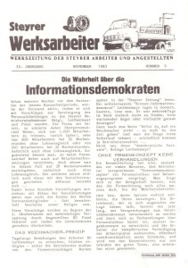 WERKSZEITUNG DER STEYRER ARBEITER UND ANGESTELLTEN 35. JAHRGANG NOVEMBER 1983 NUMMER 5 Die Wahrheit Uber die Informationsdemokraten Schon mehrere Wochen vor dem Auslaufen der letzten Kurzarbeitperiode, wurde der Vorstand aktiv, indem er sich mit Vorschlägen zur Bereinigung des Personalüberhanges an die Steyrer Betriebsratsobmänner Heigl, Leithenmayr und Pimsl wandte. Die Firma sei bereit, so erklärte dabei Oberpersonalchef Weber, sich von 1.000 Mitarbeitern zu trennen, (welch Opfer), oder von 600 Mitarbeitern bei 35 Wochenstunden ohne Lohnausgleich oder von 300 Mitarbeitern bei 32 Wochenstunden, natürlich auch ohne Lohnausgleich. Zuguterletzt könnte man, so meint Personalchef Weber auch auf Mitarbeiterfreisetzungen verzichten, doch müsse man in diesem Fall auf 28 Wochenstunden zurückgehen, natürlich auch ohne Lohnausgleich. Des weiteren müsse endlich auch etwas mit den Sozialleistungen geschehen - abbauen versteht sich ... Damit keine falschen Vorstellungen entstehen; mit Abbau der Sozialleistungen meint man nicht die Kosten der Herren Vorstandsmitglieder - Gott bewahre- Gott beschütze unser Heilges usw. Diese Vorschläge wurden zu Beginn der 3. Oktoberwoche mit mehrwöchiger Verspätung durch Angestellten BO Pimsl bekannt und ließen die Gerüchteküche geradezu überkochen. DAS WEICHMACHER-PRINZIP Tagelange Bemühungen den Arbeiter BO Leithenmayr zu erreichen, blieben erfolglos - selbst die Betriebsräte mußten von den Firmenvorschlägen Wochen später in der “Steyrer Zeitung“ lesen. Der selbsternannte “Kronen-Informationsdemokrat“ Leithenmayr tagte in Goisern, Gastein, Linz usw. Er war mehrere Tage im Werk einfach nicht zu finden, trotz wachsender Angst oder vielleicht gerade deswegen? Ganz nach dem Motto “Willst du, daß ein Weichmacher wirkt - so mußt du ihm Zeit geben“ ließ man die Dinge ihren Selbstlauf nehmen - schließlich kommen ja Betriebsratswahlen ... Nicht neu diese “demokratische Variante“, Kollege Leithenmayr? OHNE FIRMENKONZEPT KEINE VERHANDLUNGEN Die Konzernleitung hat also, anstatt des vor vielen Monaten, dem Betriebsrat versprochenen “Unternehmenskonzeptes“ ein Personalabbau und Belastungsprogramm vorgelegt. Man fragt sich in der Belegschaft bereits, was den die Firmenleitung noch alles machen muß, bis die Mehrheitsbetriebsräte bzw. deren Spitzen endlich aufhören, die Ohren anzulegen. Ein Betriebsrat, der es sich angesichts der Lage bieten läßt, bereits ein Jahr lang, mit Versprechungen zum Unternehmenskonzept verschaukelt zu werden und dann noch zu Verhandlungen über Personalabbau bereit ist, anstatt Gegenkonzepte zu entwickeln und die Arbeiter zur kämpferischen Verteidigung der Arbeitsplätze aufzurufen, offenbart unmißverständlich seine Schwäche, und wird von den Konzernherren nur aus Gründen des guten Tones, also scheinbar ernst genommen. Fortsetzung siehe nächste Seite