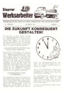 Steyrer Werksarbeiter WERKSZEITUNG DER STEYRER ARBEITER UND ANGESTELLTEN 35. JAHRGANG DEZEMBER 1983 NUMMER 6 DIE ZUKUNFT KONSEQUENT GESTALTEN! Die nach wie vor etwas labile Auftrags- u. Beschäftigungslage erfordert seitens des Betriebsrates ein entschlossenes zielstrebiges Handeln. Es hat den Anschein, als ließen sich die Kollegen der Mehrheitsfraktion nach vollbrachter Wahlarbeit in ihre Sessel zurück — fallen. Damit ist jedoch niemandem geholfen. BELEGSCHAFTSVERTRETUNG MUSS AKTIV WERDEN ! Jetzt wird es sich zeigen, was die Versprechungen in Vorwahlzeiten bezüglich der Beschäftigungsabsicherung wert waren. Dabei wird die Entschlossenheit und Tatkraft seitens der gesamten Be- iriebsratskör per schäft ausschlagendgebend sein, um nicht von der Konzernleitung an die Wand gespielt zu werden Zweifellos wird es bis zum Wirken der kommenden Auslandsaufträge noch eine schwierige Phase geben. Gerade deshalb müssen von der Belegschaftsvertretung rechtzeitig jene Maßnahmen entwickelt werden, die der Situation vom Arbeiterstandpunkt her gesehen entsprechen. KONSEQUENTE LINIE NOTWENDIG ! Die Belegschaft erwartet mit Recht eine konsequente klare Linie in den kommenden Auseinandersetzungen. Dabei müssen einem anhaltenden Personalüberhang, die Forderungen nach einer 35-Stunden- Woche mit Lohnausgleich, sowie ein Nachziehen bei der Aktion 52 bzw. 57 entgegen gestellt werden. Die Arbeiterschaft der Nutzfahrzeugindustrie verwehrt sich mit Recht gegen die Tatsache, als Arbeiter zweiter Klasse behandelt zu werden. Was in der Stahlindustrie möglich und notwendig war, muß auch in der Fahrzeugindustrie machbar sein, wenn die Verhältnisse es erfordern. Die unternehmerische Alternative zur 35-Stunden-Woche und Aktion 57 heißt "KÜNDIGUNGEN". Dies aber ist und bleibt die schlechteste, ungerechteste, gefährlichste und teuerste Form der Arbeitszeitverkürzung . Sie muß in geschlossenem Kampf verhindert werden.